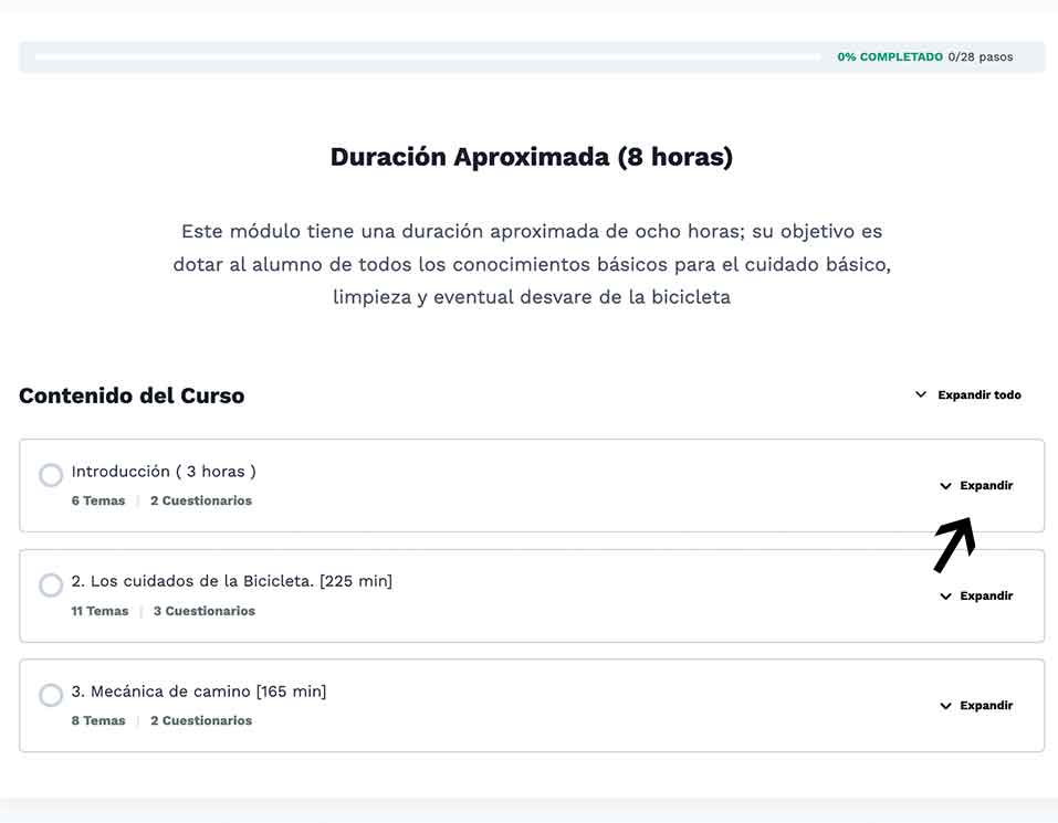 Ya en el curso encuentra el modulo, click en el botón expandir y se ven los temas de cada modulo a desarrollar.